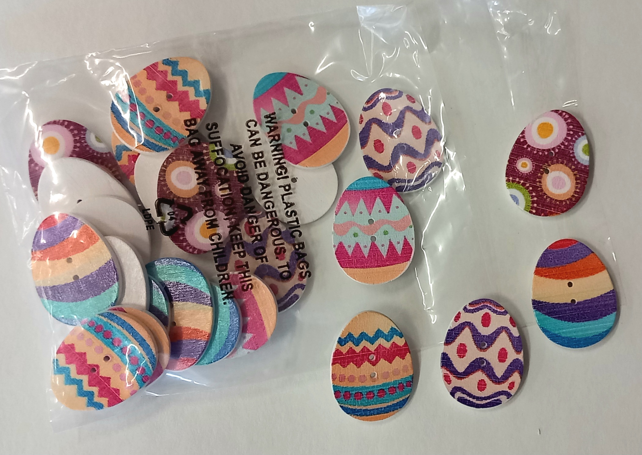 - 25 Easter Egg shaped and decorated buttons with 5 different designs within each pack